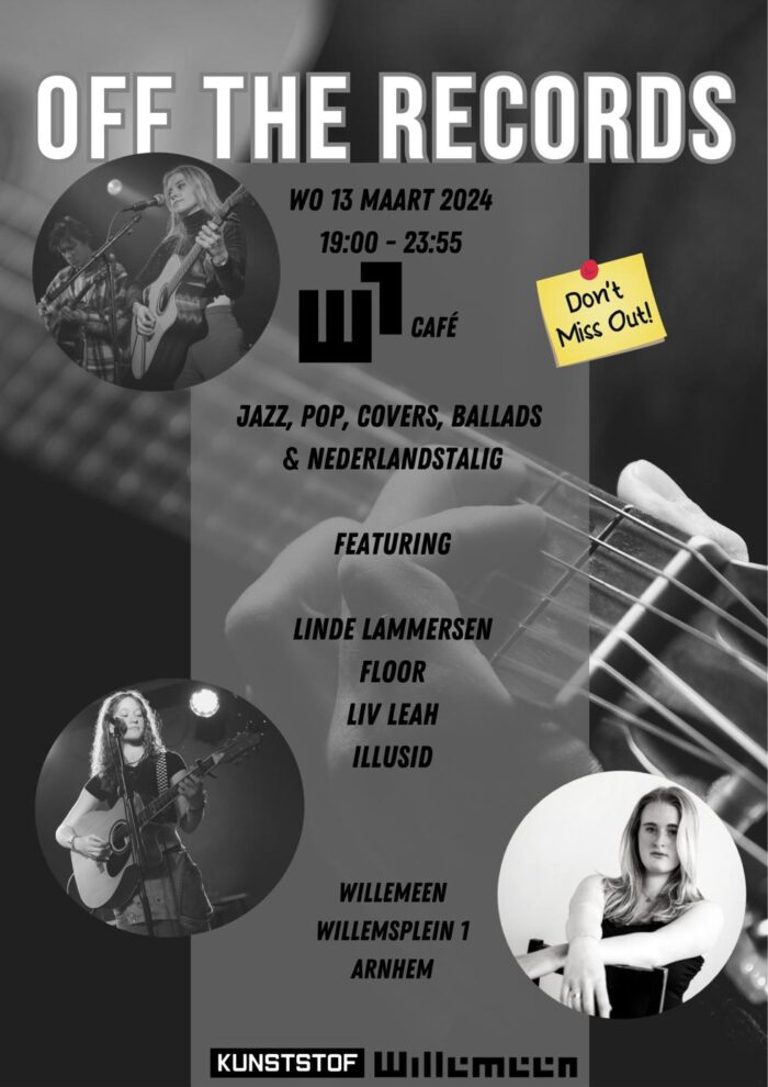 OFF THE RECORDS is een samenwerkingsproject tussen Willemeen en Kunststof Arnhem. Zij zetten beginnende talentvolle artiesten op het podium in Willemeen. Kom langs, onze vrijwilligers staan weer klaar voor publiek in het gezellige W1 Cafe en de bar is open! GRATIS ENTREE