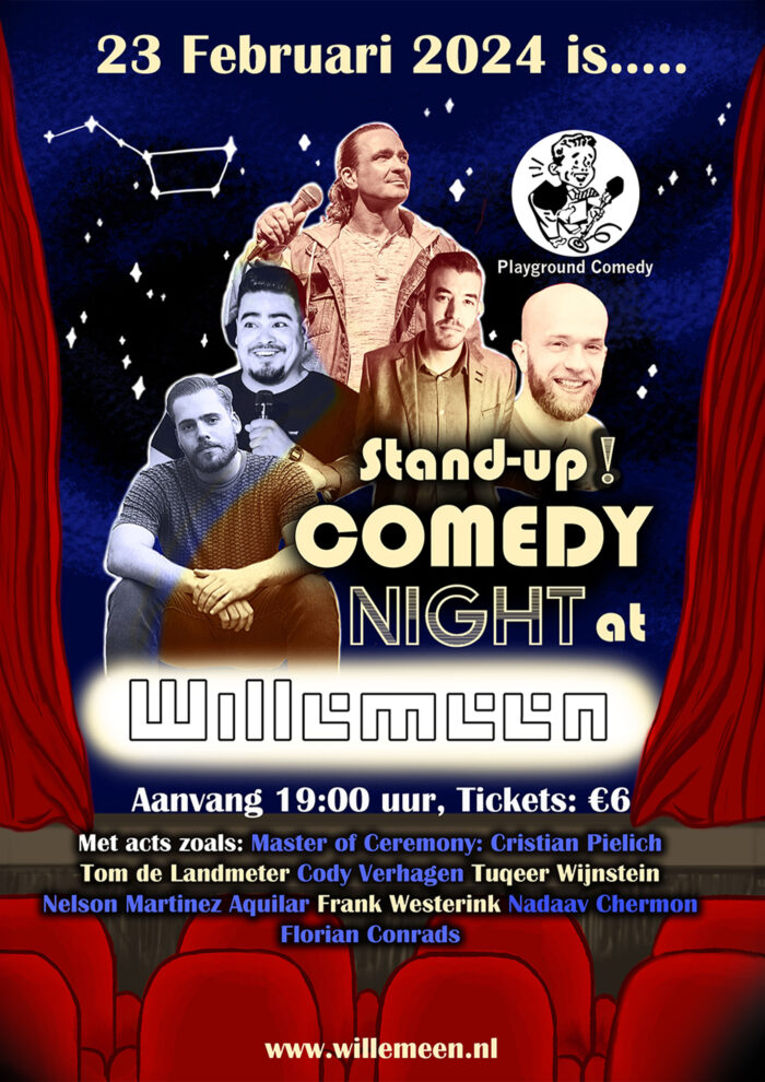 Kom binnen bij Willemeen voor een avond vol gezelligheid en hilariteit. Schuif lekker aan voor een komische try-out Stand Up Comedy Show met tal van ervaren en aanstormende er ervaren comedians. In een knusse cafΓ©setting wisselen ruim 5 tot 7 verse talenten en profcomedians elkaar af met korte shows. Zij brengen hun betere grappen en oneliners en testen hun nieuwste vondsten en geestige anekdotes. Een interactieve en onderhoudende try-out show met diverse karakters en types uit het hele land.