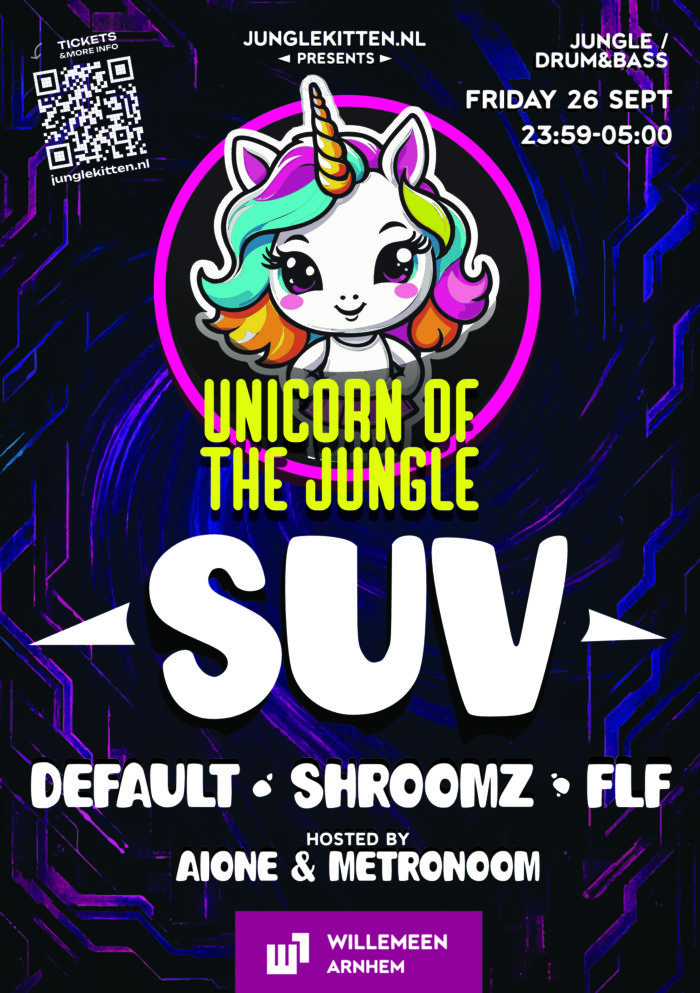 Er komt namelijk een nieuwe editie van Unicorn of the Jungle aan in de Willemeen. Met trots organiseren wij onze 5de editie, voor de tweede keer in deze prachtige rauwe venue die perfect past bij onze organisatie. Het belooft weer een waanzinnige avond te worden met de volgende artiesten op het menu: Suv, Shroomz, FLF en Default waarbij de avond gehost zal worden door Metronoom. Dus laat jezelf verrassen en kom proeven van de sfeer.